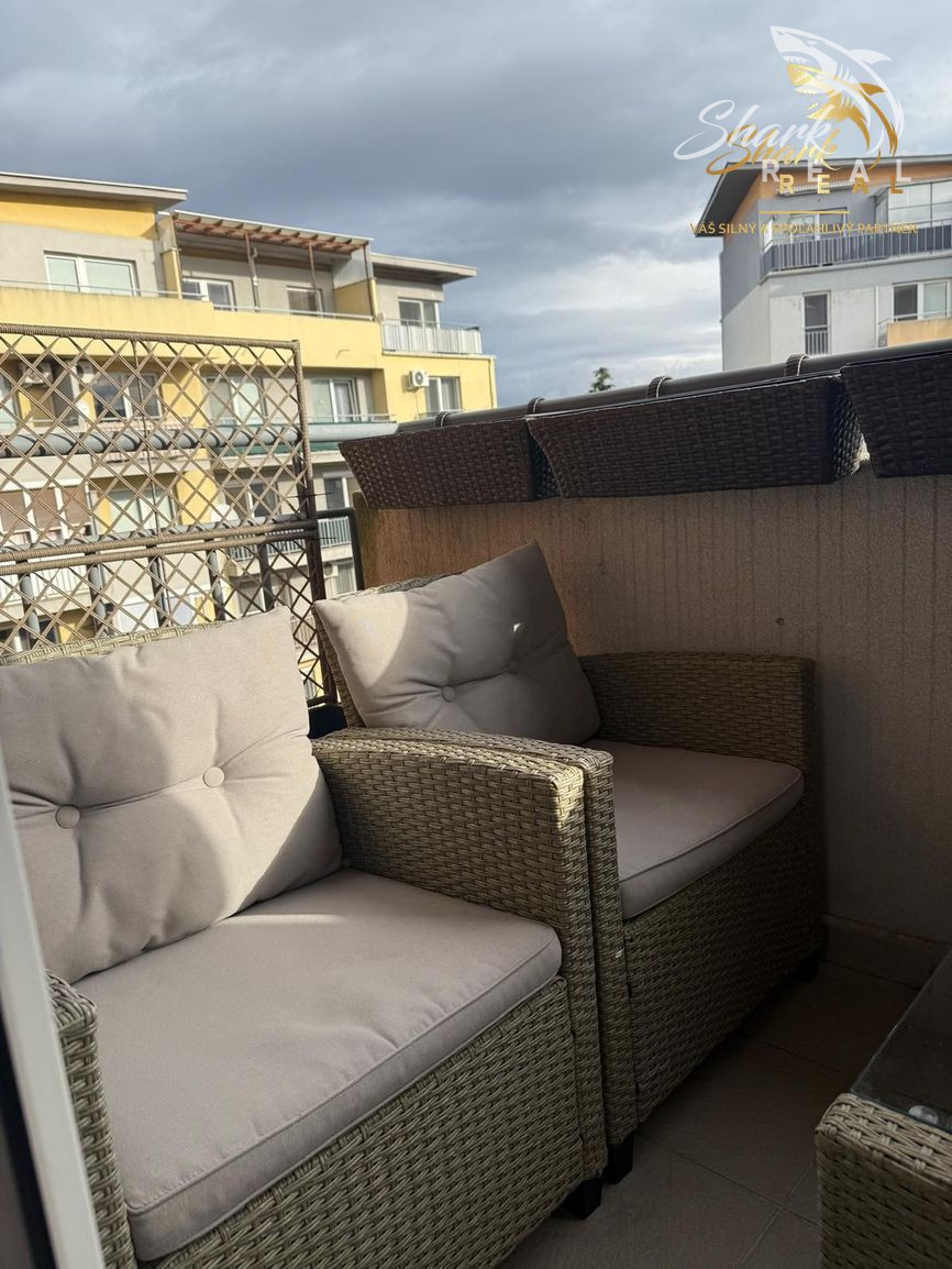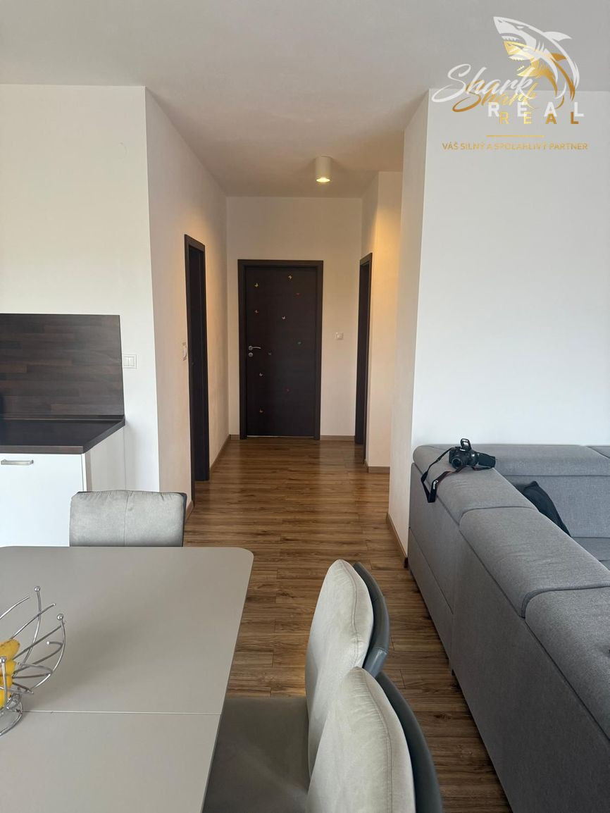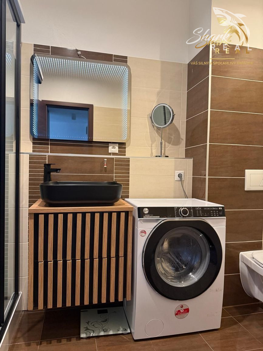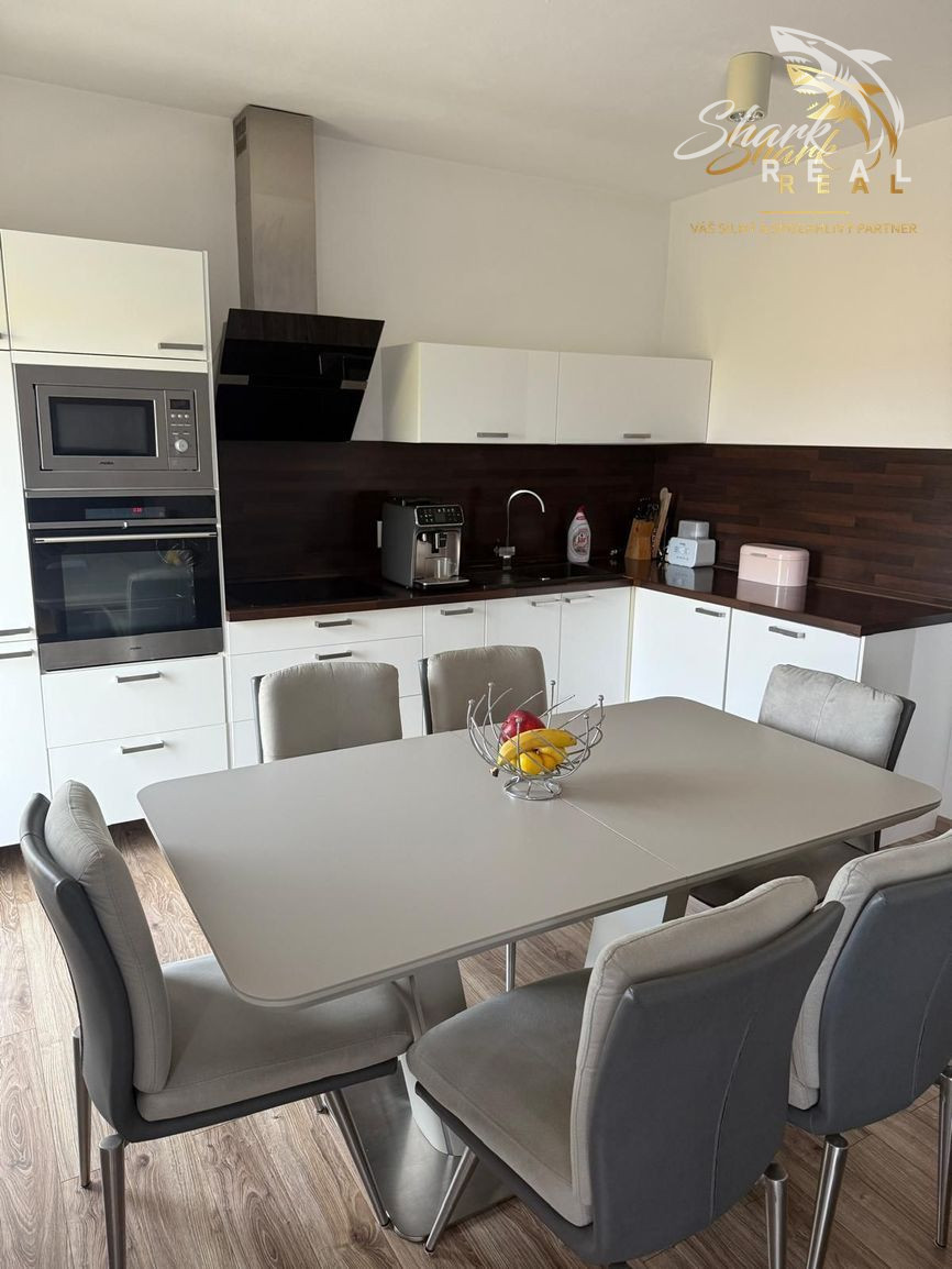 Interiér je navrhnutý s citom pre detail - kvalitné materiály, moderný nábytok, stavané skrine a plne vybavená kuchyňa so spotrebičmi.