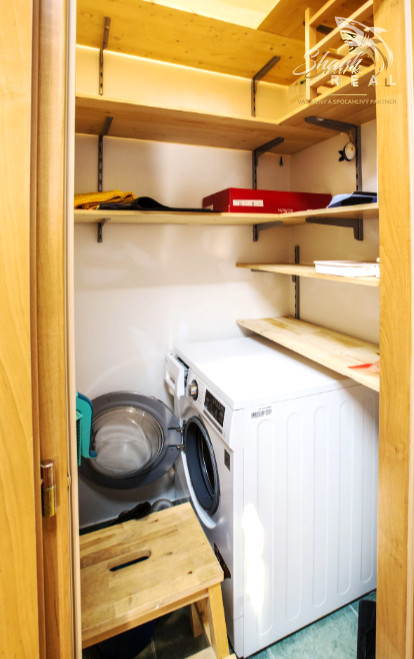 Technická miestnosť : automatická práčka, regály na odkladanie rôzneho materiálu potrebného k upratovaniu a pod.