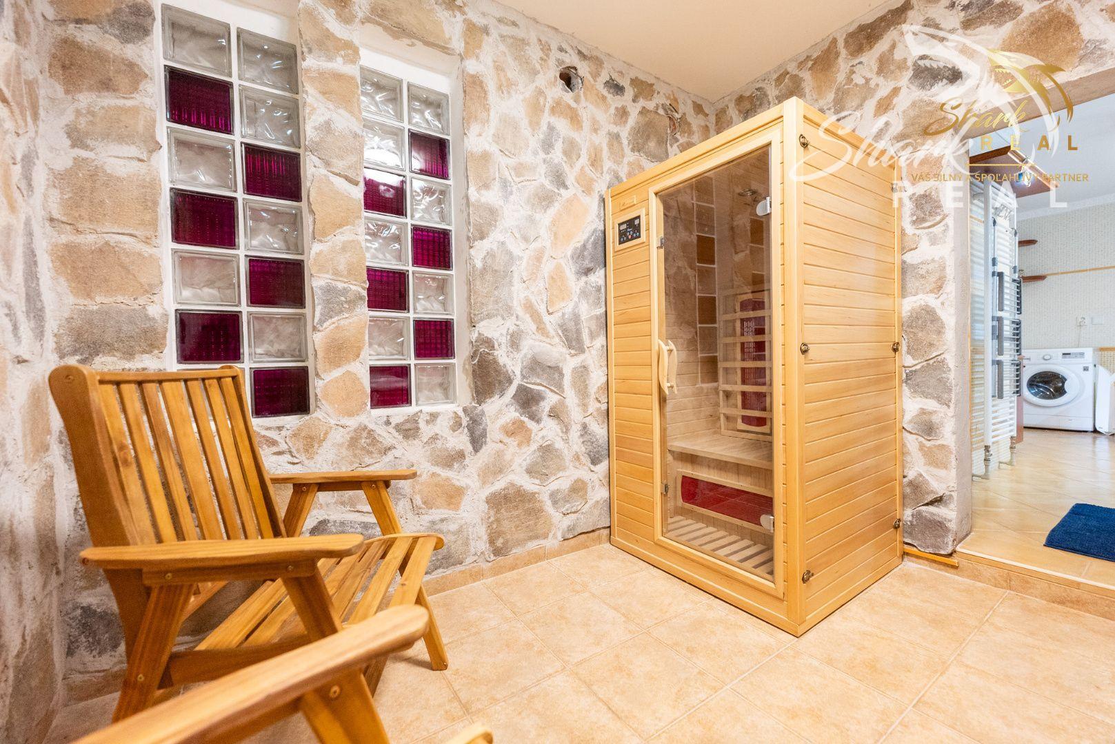 V hl. dome sa nachádza, veľká chodba, 5 izieb(2x prízemie,3x podkrovie), presvetlená obývacia miestnosť, kuchyňa spojená s jedálnou , 2x wc a kúpeľňa, relaxačná miestnosť - masážna vaňa a sauna, tajná mini miestnosť a vonkajšia terasa.