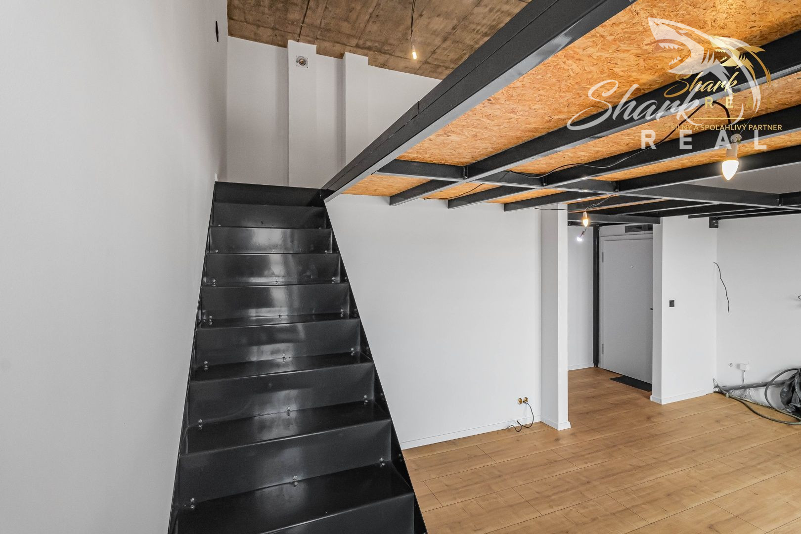 Celý priestor je z väčšej časti horizontálne rozdelený pomocou kvalitnej a pevnej hrubostennej železnej konštrukcie, na ktorej je aplikovaná tlmiaca pena na ktorej sú uložené OSB dosky – celá konštrukcia je predimenzované na vyššiu nosnosť. Vytvorené poschodie tak tvorí oddelenú nočná časť bytu spolu s pracovným kútom. Poschodie je so spodnou časťou bytu prepojené pomocou železného schodiska.