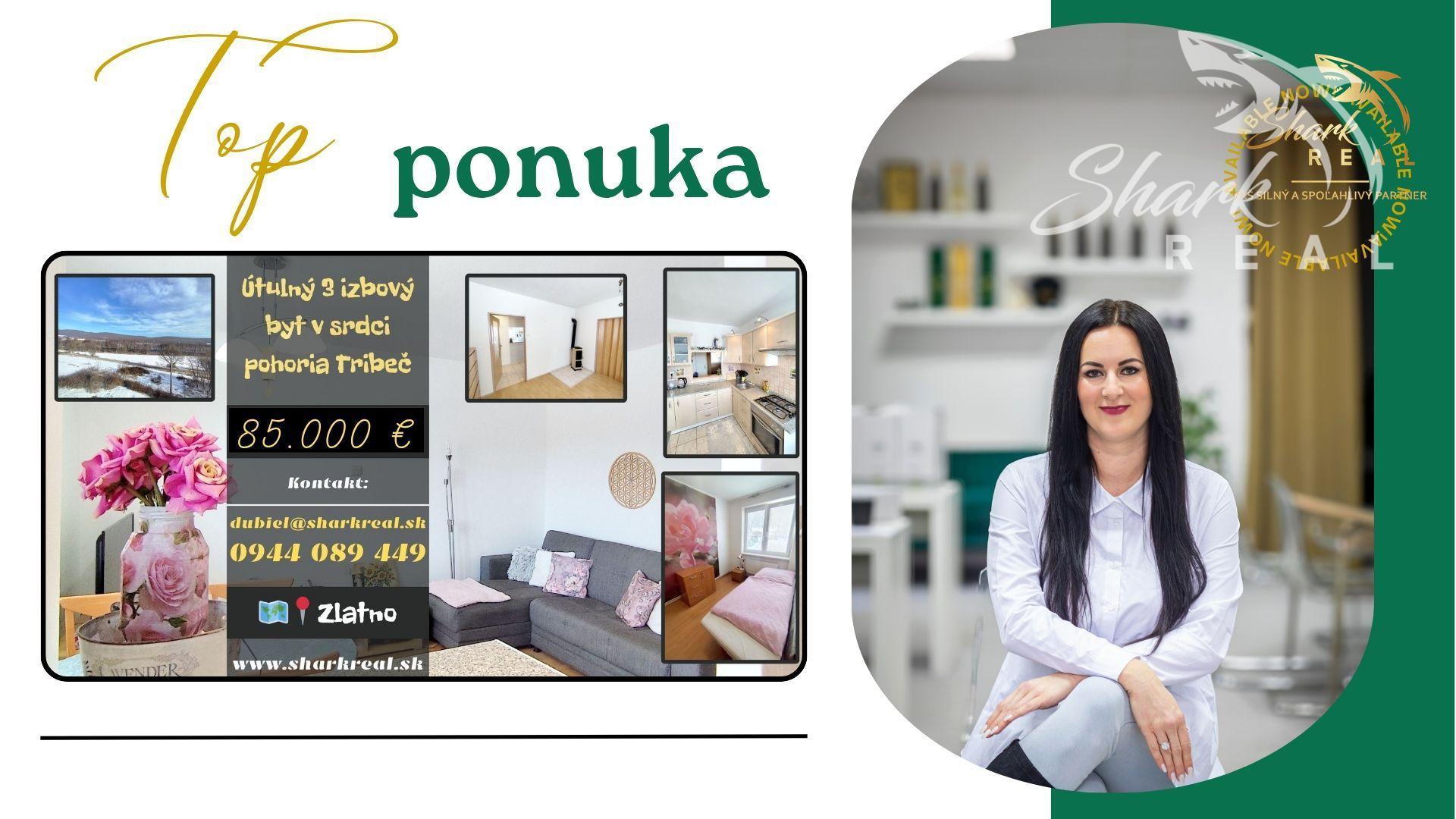 SHARK Real Vám vo výhradnom zastúpení ponúka na predaj priestranný 3 izbový byt, v tichej lokalite a krásnej prírode pohoria Tribeč, v obci Zlatno, neďaleko Zlatých Moraviec.