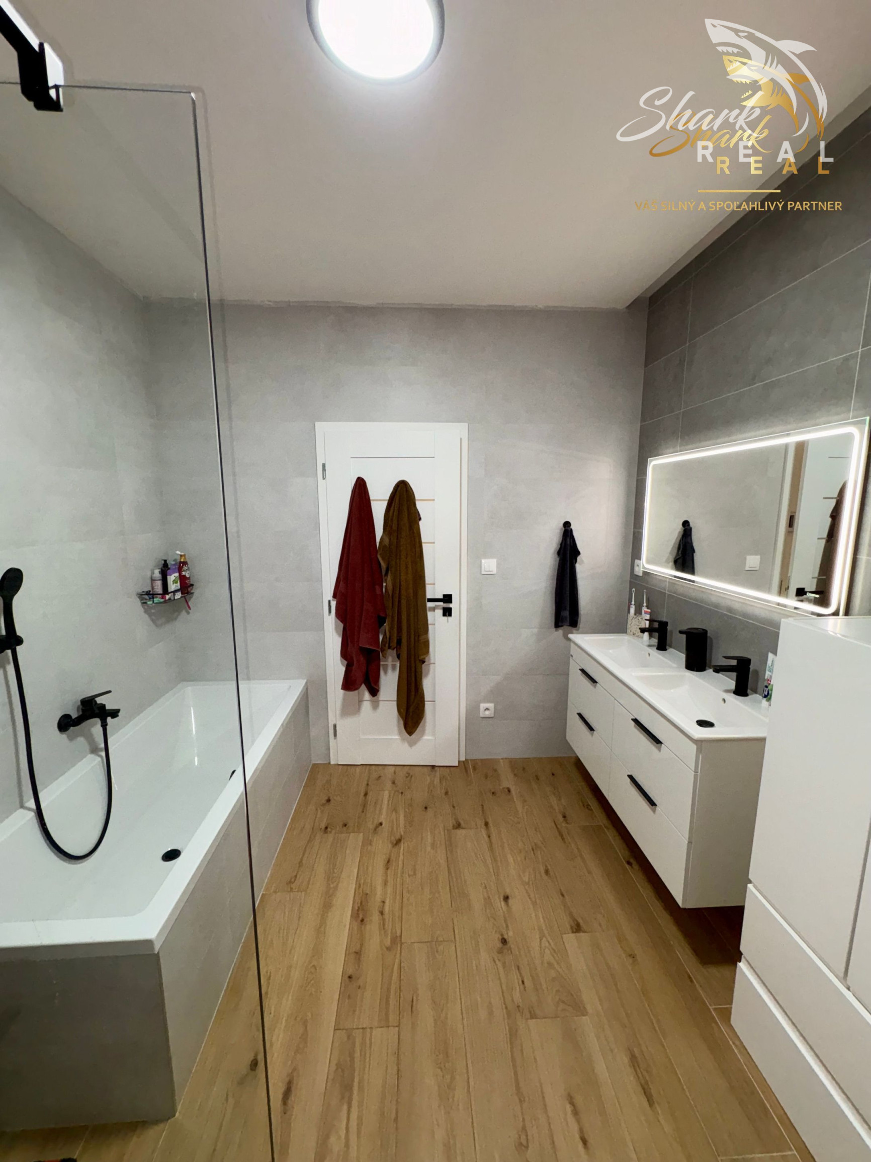 Kúpeľňa: vaňa, sprchový kút, dvojumývadlo, WC